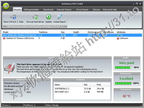 Ashampoo HDD Control 2 提供了對硬碟的完整監控。軟體不僅支援常規的IDE 和SATA